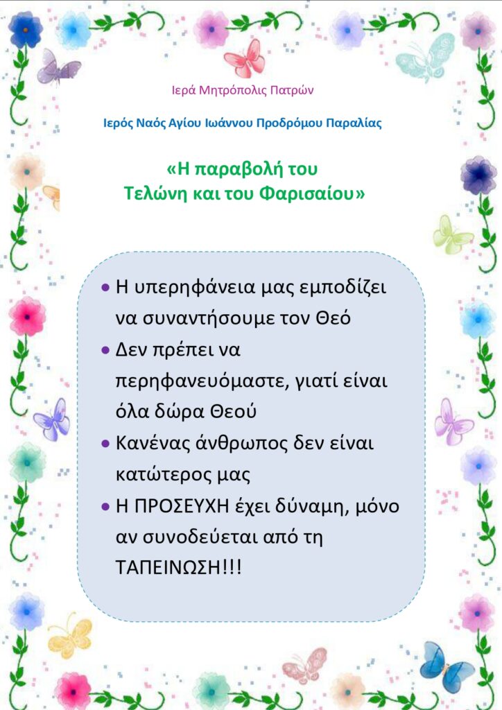 Παραβολή του Τελώνου και του Φαρισαίου / Κατηχητικό Προσχολικής & Α΄ Δημοτικού 25Δ Δείτε το online μάθημα εδώ! Πλοήγηση άρθρων Προηγούμενη Προηγούμενο άρθρο: “Ημέρα χαρμόσυνος…” 16 ΧΡΟΝΙΑ ΑΠΟ ΤΗΝ ΕΙΣ ΕΠΙΣΚΟΠΟΝ ΧΕΙΡΟΤΟΝΙΑ ΤΟΥ ΜΗΤΡΟΠΟΛΙΤΟΥ ΠΑΤΡΩΝΕπόμενη Επόμενο άρθρο: Η παραβολή του Τελώνη και του Φαρισαίου / Κατηχητικό Γυμνασίου & Λυκείου Αφήστε μια απάντηση Ακύρωση απάντησηςΗ ηλ. διεύθυνση σας δεν δημοσιεύεται. Τα υποχρεωτικά πεδία σημειώνονται με *Σχόλιο * Όνομα * Email * Ιστότοπος Αποθήκευσε το όνομά μου, email, και τον ιστότοπο μου σε αυτόν τον πλοηγό για την επόμενη φορά που θα σχολιάσω.