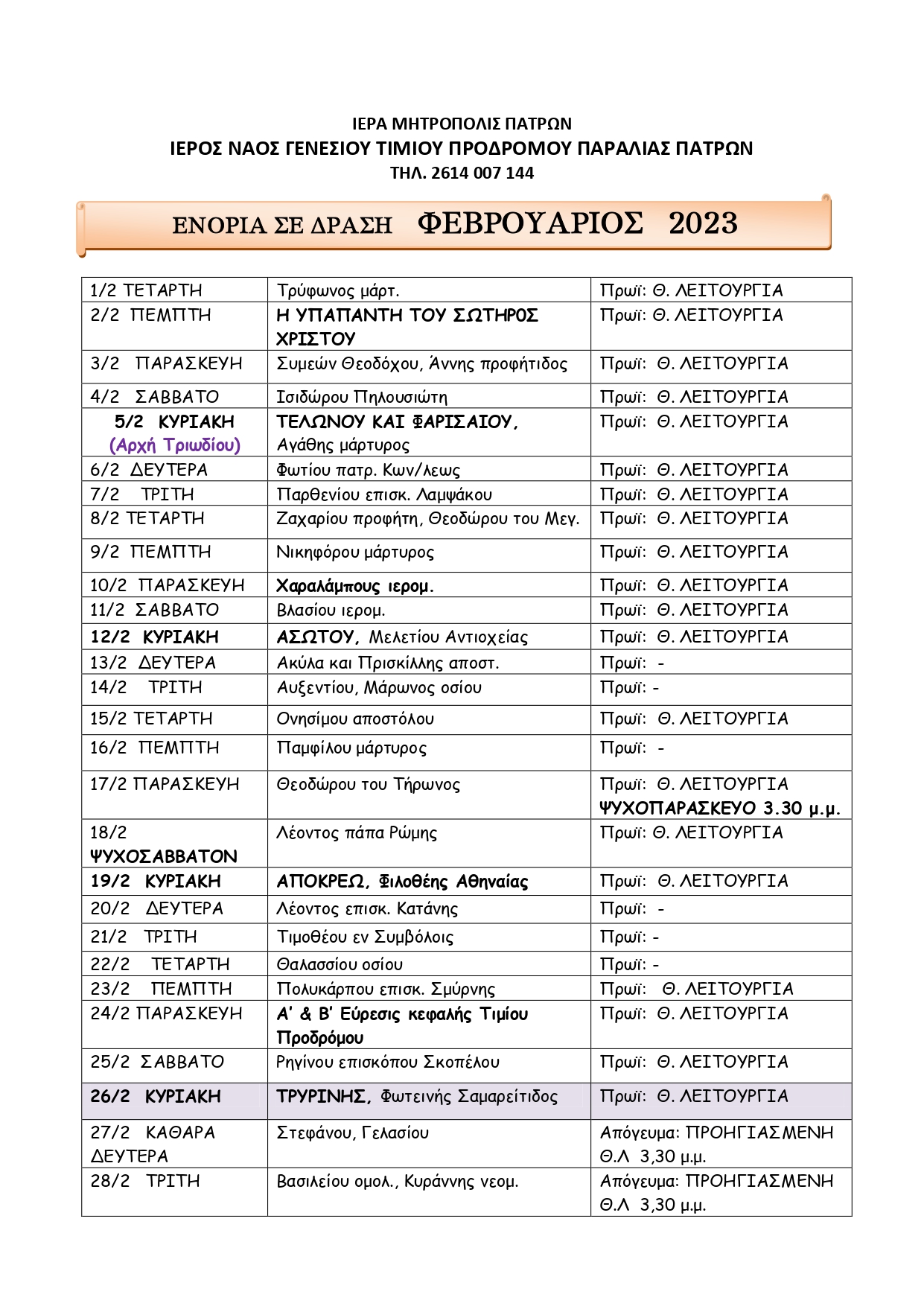 Πρόγραμμα Ιερών Ακολουθιών Ιερού Ναού Γενεσίου Τιμίου Προδρόμου Παραλίας Πατρών 31Δ Φεβρουάριος 2023 Πλοήγηση άρθρων Προηγούμενη Προηγούμενο άρθρο: Προσκύνημα της ιερής εικόνας της Παναγίας του Όρους των ΕλαιώνΕπόμενη Επόμενο άρθρο: Πρόγραμμα Ιερών Ακολουθιών και δράσεων του Ιερού Ναού Γενεσίου Τιμίου Προδρόμου Παραλίας Πατρών. Αφήστε μια απάντηση Ακύρωση απάντησηςΗ ηλ. διεύθυνση σας δεν δημοσιεύεται. Τα υποχρεωτικά πεδία σημειώνονται με *Σχόλιο * Όνομα * Email * Ιστότοπος Αποθήκευσε το όνομά μου, email, και τον ιστότοπο μου σε αυτόν τον πλοηγό για την επόμενη φορά που θα σχολιάσω.