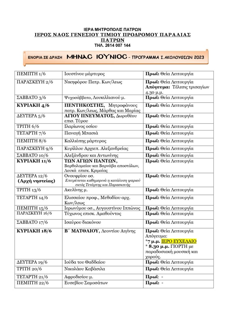 Πρόγραμμα ιερών ακολουθιών 01Δ Ιερός Ναός Γενεσίου Τιμίου Προδρόμου Παραλίας Πατρών Ιουνίου 2023 Πλοήγηση άρθρων Προηγούμενη Προηγούμενο άρθρο: Εγκύκλιος Μητροπολίτη κ.κ. Χρυσοστόμου πατρώνΕπόμενη Επόμενο άρθρο: Θ’ ΠΡΟΔΡΟΜΕΙΑ 2023 Αφήστε μια απάντηση Ακύρωση απάντησηςΗ ηλ. διεύθυνση σας δεν δημοσιεύεται. Τα υποχρεωτικά πεδία σημειώνονται με *Σχόλιο * Όνομα * Email * Ιστότοπος Αποθήκευσε το όνομά μου, email, και τον ιστότοπο μου σε αυτόν τον πλοηγό για την επόμενη φορά που θα σχολιάσω.