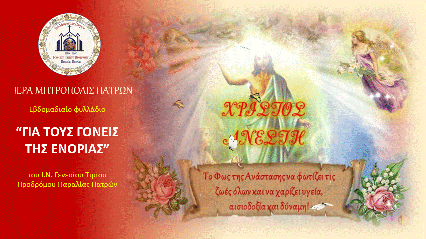 Εβδομαδιαίο φυλλάδιο “ΓΙΑ ΤΟΥΣ ΓΟΝΕΙΣ ΤΗΣ ΕΝΟΡΙΑΣ” του Ι.Ν. Γενεσίου Τιμίου Προδρόμου Παραλίας Πατρών, με σύντομα και όμορφα ψυχωφελή θέματα σας συντροφεύει κάθε στιγμή στη μέρα.