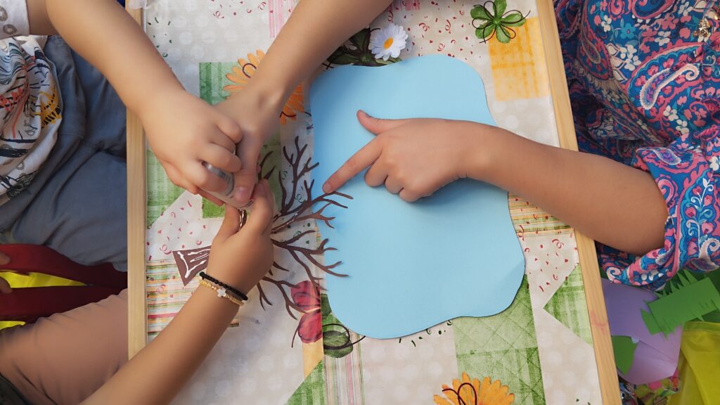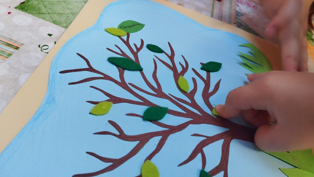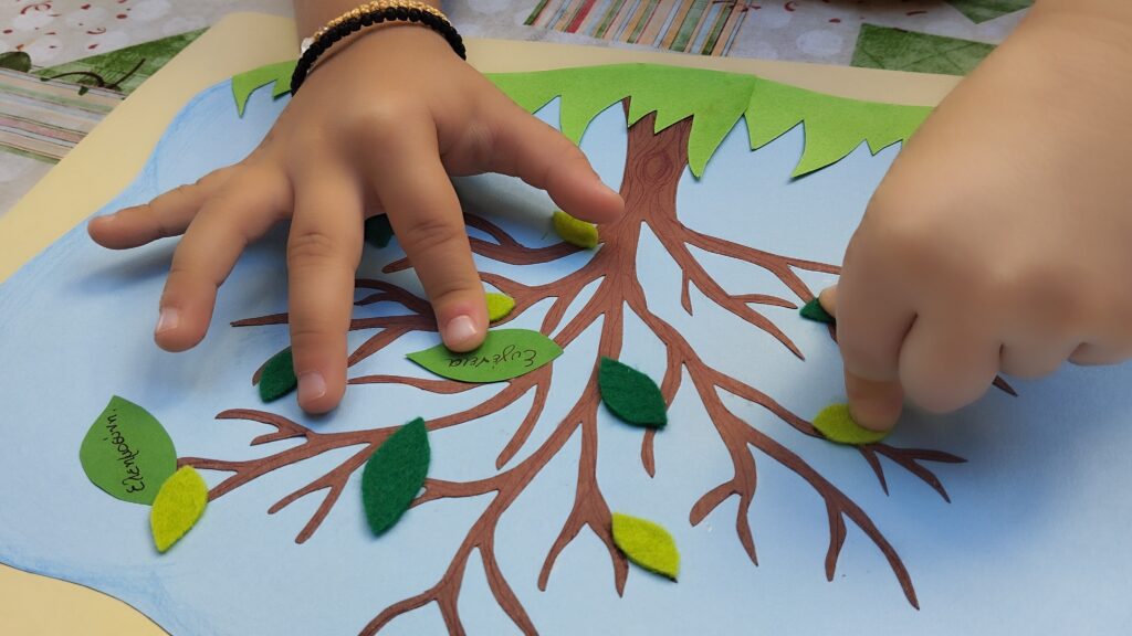 Σχεδιάσαμε ένα δέντρο με κλαδιά σε χαρτόνι και μοιράσαμε στα παιδιά μικρά χαρτάκια ή φυλλαράκια. Ζητήσαμε από κάθε παιδί να γράψει (ή να ζωγραφίσει) πάνω σε ένα φύλλο μια αρετή ή κάτι που θα ήθελε να μάθει στο κατηχητικό (π.χ. αγάπη, καλοσύνη, υπομονή). Στη συνέχεια, το κάθε παιδί κολλάει το χαρτάκι στο δέντρο.