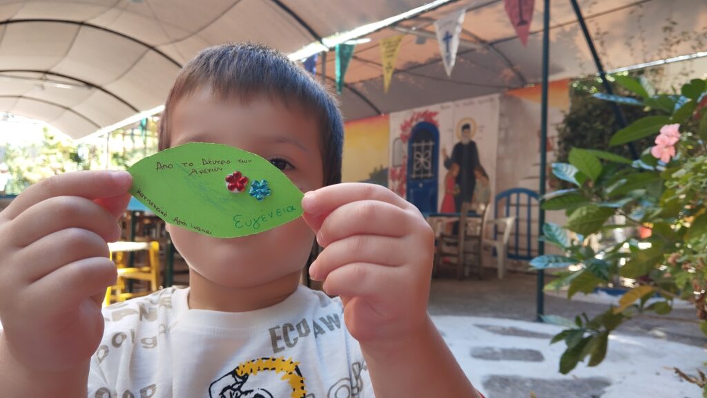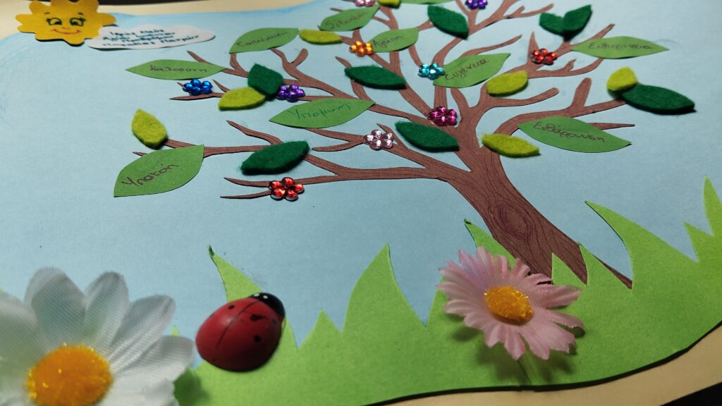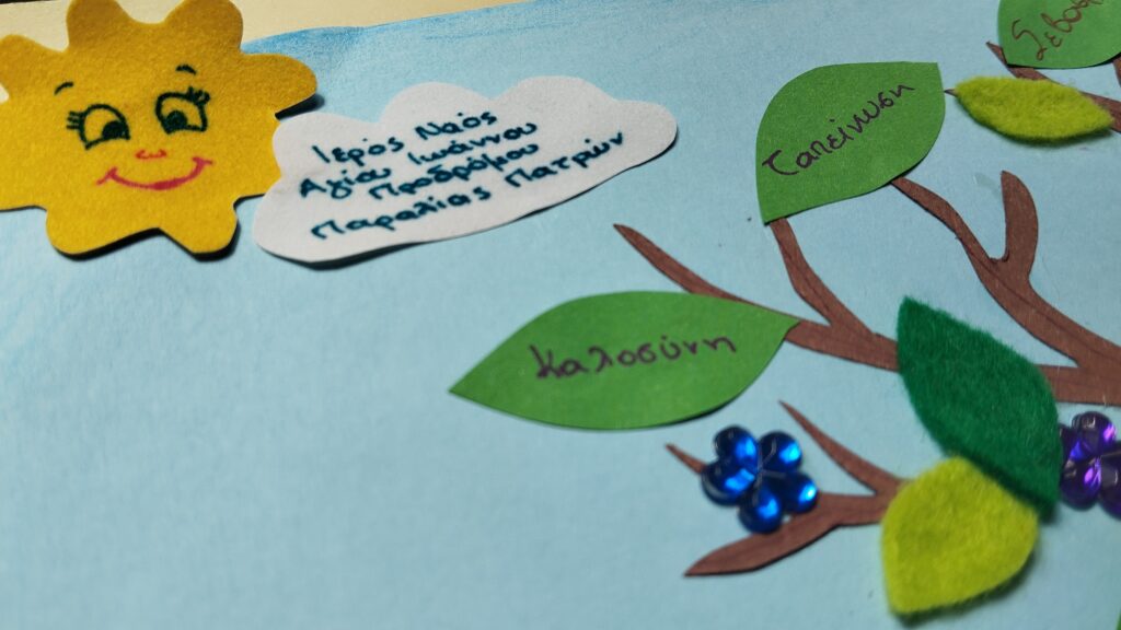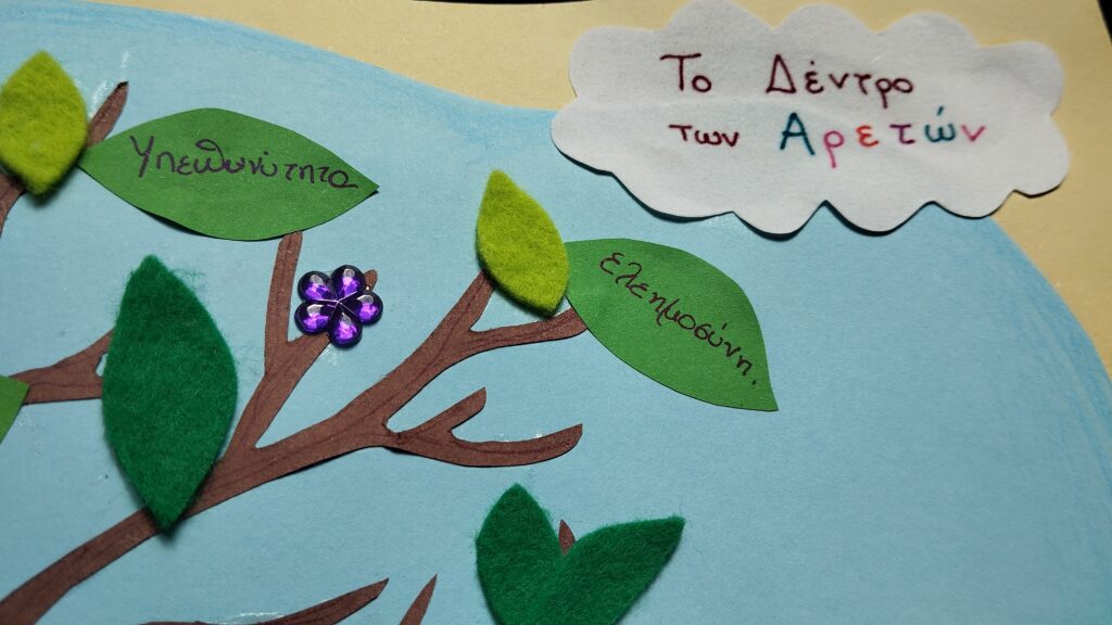 “Σήμερα θα φτιάξουμε ένα πολύ ξεχωριστό δέντρο. Δεν θα είναι ένα συνηθισμένο δέντρο, αλλά το Δέντρο των Αρετών. Ξέρετε τι είναι οι αρετές; Είναι όλα τα καλά πράγματα που κάνουμε και λέμε, και μας βοηθάνε να είμαστε πιο κοντά στον Θεό!”