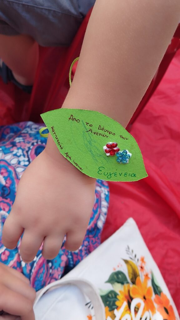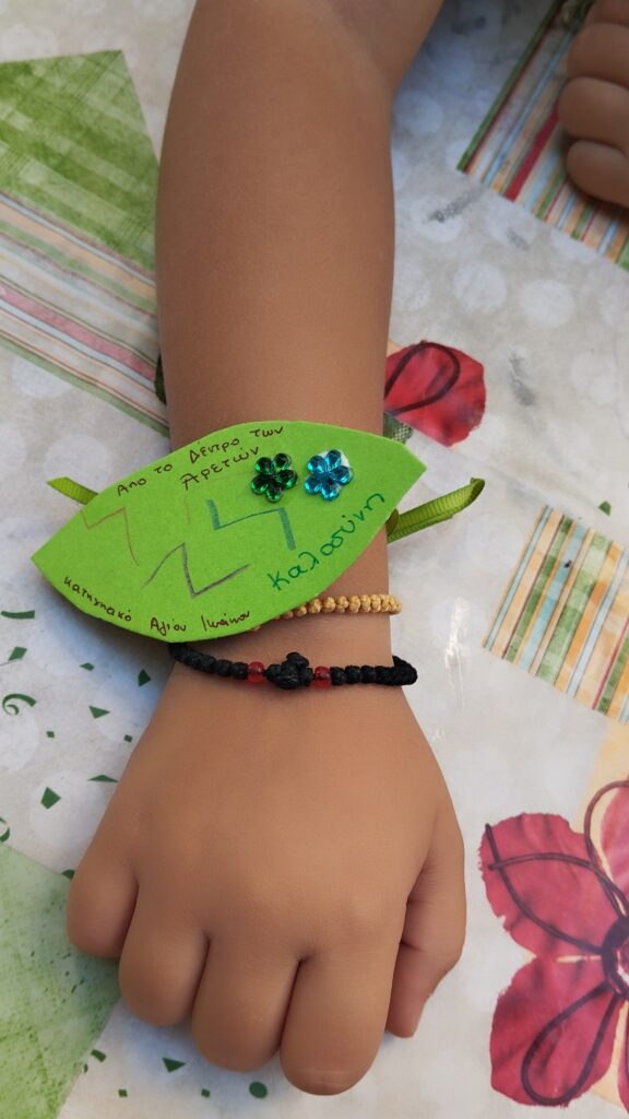 Στην συνέχεια το κάθε παιδάκι ζωγράφισε μια καλή πράξη στο φύλλο και γράψαμε την αρετή που του άρεσε πιο πολύ την στολίσαμε και με κορδέλα το δέσαμε στο χεράκι μας. Για να θυμόμαστε ότι το φύλλο αυτό είναι από το δέντρο των αρετών και πως και εμείς ομορφαίνουμε με τις αρετές όπως το ανθισμένο δέντρο