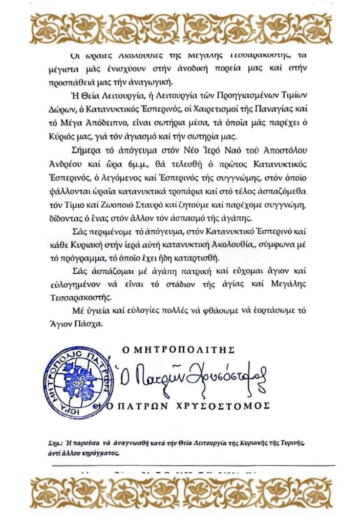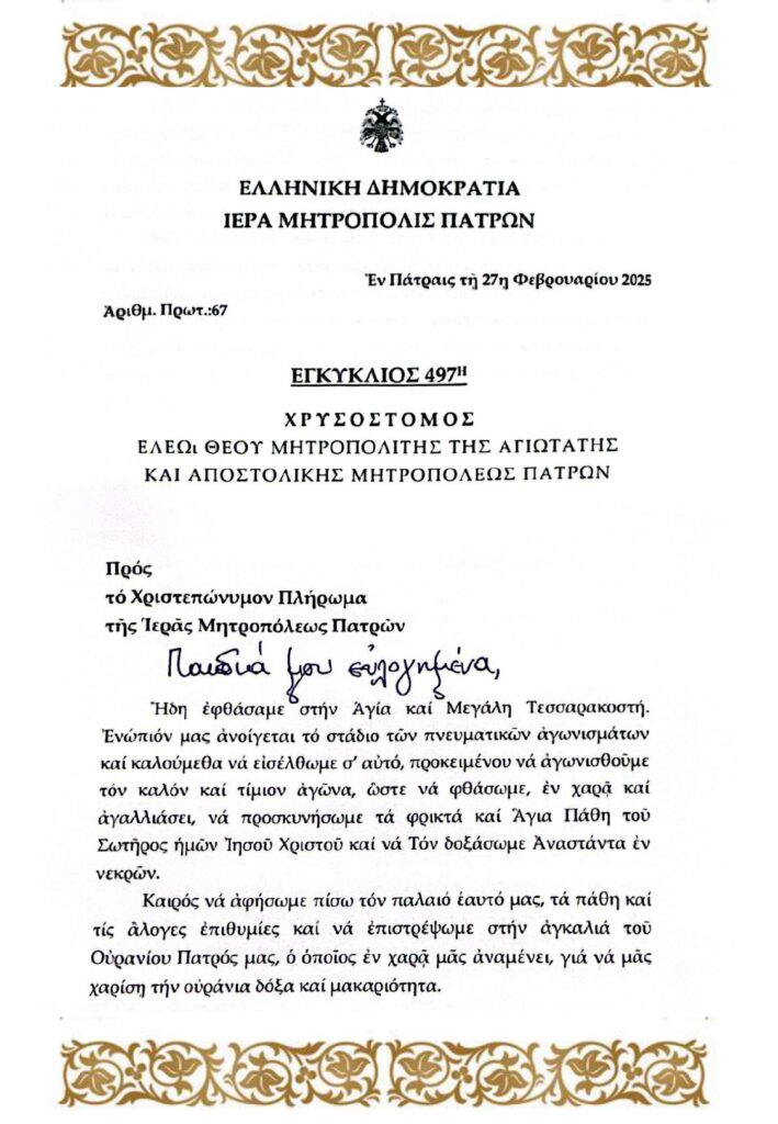 ΕΓΚΥΚΛΙΟΣ ΣΕΒΑΣΜΙΩΤΑΤΟΥ ΜΗΤΡΟΠΟΛΙΤΟΥ ΠΑΤΡΩΝ κ.κ. ΧΡΥΣΟΣΤΟΜΟΥ Μ. ΤΕΣΣΑΡΑΚΟΣΤΗΣ 27Δ Πλοήγηση άρθρων Προηγούμενη Προηγούμενο άρθρο: Πρόγραμμα Κατανυκτικών Εσπερινών Μεγάλης Τεσσαρακοστής 2025Επόμενη Επόμενο άρθρο: ΠΡΟΓΡΑΜΜΑ ΣΕΒΑΣΜΙΩΤΑΤΟΥ κ.κ. ΧΡΥΣΟΣΤΟΜΟΥ Μ. ΤΕΣΣΑΡΑΚΟΣΤΗΣ 2025 Αφήστε μια απάντηση Ακύρωση απάντησηςΗ ηλ. διεύθυνση σας δεν δημοσιεύεται. Τα υποχρεωτικά πεδία σημειώνονται με *Σχόλιο * Όνομα * Email * Ιστότοπος Αποθήκευσε το όνομά μου, email, και τον ιστότοπο μου σε αυτόν τον πλοηγό για την επόμενη φορά που θα σχολιάσω.