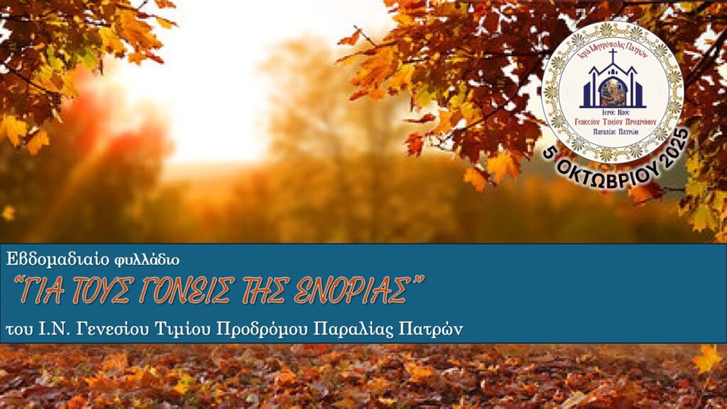 Εβδομαδιαίο φυλλάδιο “ΓΙΑ ΤΟΥΣ ΓΟΝΕΙΣ ΤΗΣ ΕΝΟΡΙΑΣ” του Ι.Ν. Γενεσίου Τιμίου Προδρόμου Παραλίας Πατρών, με σύντομα και όμορφα ψυχωφελή θέματα σας συντροφεύει κάθε στιγμή στη μέρα.