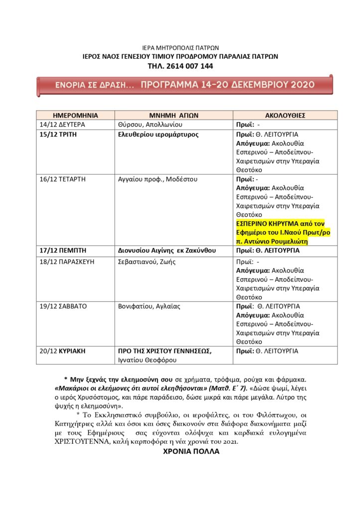 ΠΡΟΓΡΑΜΜΑ 14-20 ΔΕΚΕΜΒΡΙΟΥ 2020 ΤΟΥ ΙΕΡΟΥ ΝΑΟΥ ΓΕΝΕΣΙΟΥ ΤΙΜΙΟΥ ΠΡΟΔΡΟΜΟΥ ΠΑΡΑΛΙΑΣ ΠΑΤΡΩΝ 13Δ Πλοήγηση άρθρων Προηγούμενη Προηγούμενο άρθρο: Περιμένοντας τον Μεσσία (Κατηχητικό Δ΄- ΣΤ΄Δημοτικού)Επόμενη Επόμενο άρθρο: Ο Άγιος Ιωσήφ ο Μνήστωρ (Online Κατηχητικό Γυμνασίου & Λυκείου) Αφήστε μια απάντηση Ακύρωση απάντησηςΗ ηλ. διεύθυνση σας δεν δημοσιεύεται. Τα υποχρεωτικά πεδία σημειώνονται με *Σχόλιο * Όνομα * Email * Ιστότοπος Αποθήκευσε το όνομά μου, email, και τον ιστότοπο μου σε αυτόν τον πλοηγό για την επόμενη φορά που θα σχολιάσω.